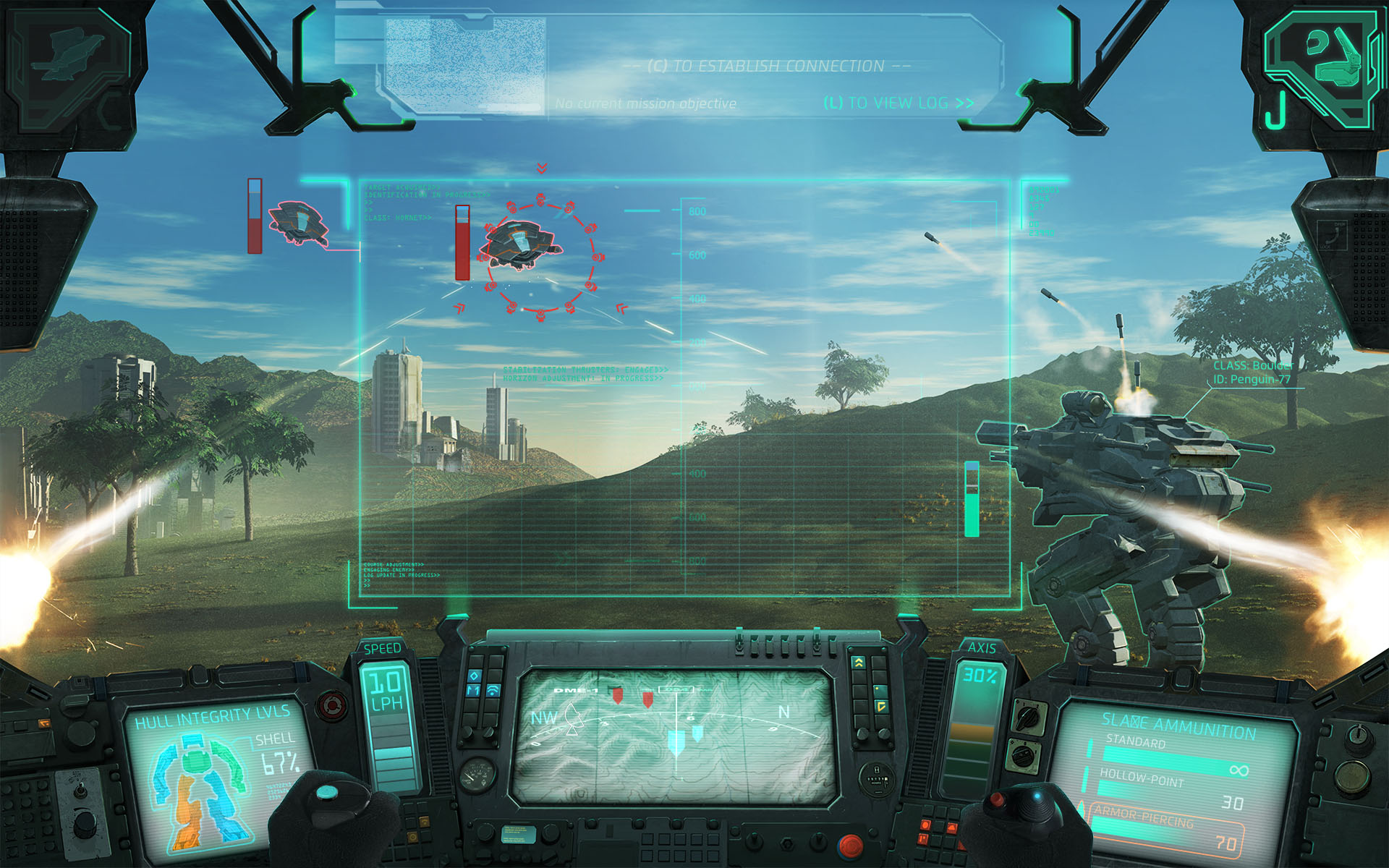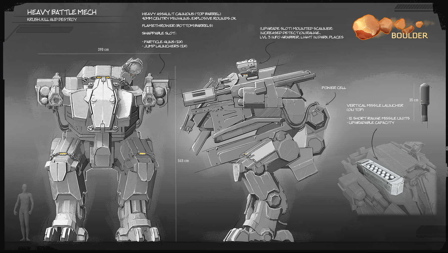 Every Boulder was made for one purpose: to crush. A fantastic 80/20 defense rating allows it to endure a lot of damage while dealing out punishment of its own. Boulder is good at that: mechs have a generally low damage output when compared to other machines, but Boulder compensates with a versatile arsenal, which includes a flamethrower, 2×40mm Centry miniguns thoughtfully upgraded with a lvl 2 TFX cooldown module, and a 12-slot rocket launcher. Running away isn’t an option, and given Boulder’s speed, it’s a precaution for its pilot as well.