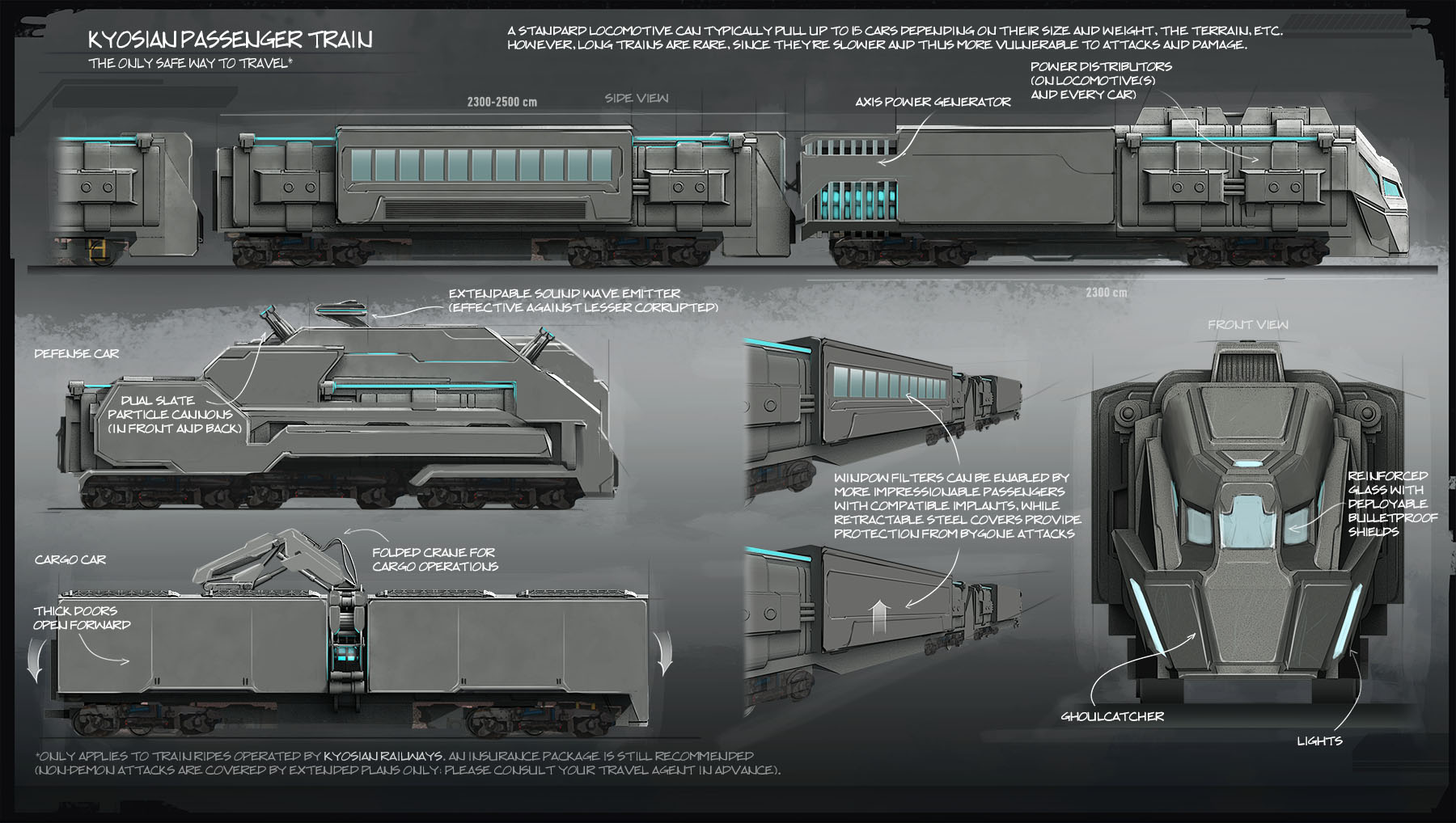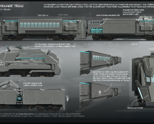 One cannot overestimate the importance trains bear for citizens of domes, and social, cultural and scientific evolution of their post-War civilization. That trains have such unique properties was discovered by accident: a train of desperate refugees left one doomed place for another soon after the Collapse; not only did it reach its destination safely, having been ignored by Demons along the way, but its passengers also enjoyed the company of each other in the objective reality. For tens of years Tetrians thought speed was the key to achieving the desired effect, but the first launch of Phoenix aircraft in 72 AW proved them wrong as a solemn demonstration quickly turned into a bloody aerial parade. Hundreds of years later, the mystery remains unsolved despite many valiant attempts made by the best of their generations. Either way, most septs don’t look a gift horse in the mouth, and use trains to safely transport passengers and cargo between DCs without giving the phenomenon too much thought.