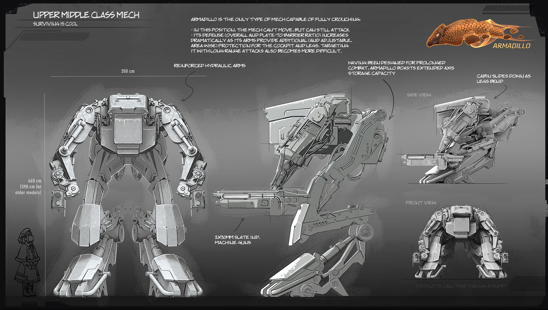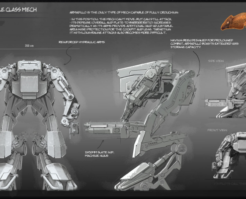 One would probably expect a decent firepower from a medium-class mech, but Armadillo scores last in the category. Helmsmen went for a more balanced machine, capable of withstanding and dodging a significant amount of damage, particularly when crouching. Armadillo is built to wear its opponents down, and is especially effective when deployed in pairs.