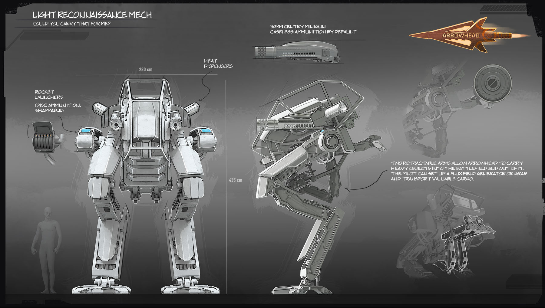 A nimble machine with fine offensive capabilities, Arrowhead requires pilot with excellent reflexes, one who’ll be gone long before big guns are rolled out. Best suited for scouting mobs ahead and aggroing them with surprise attacks, T-80 is capable of traversing even the most hazardous and difficult terrains at high speeds, and is equipped with 2×30mm Centry miniguns and 2× multi-purpose 6-slot rocket launchers.
