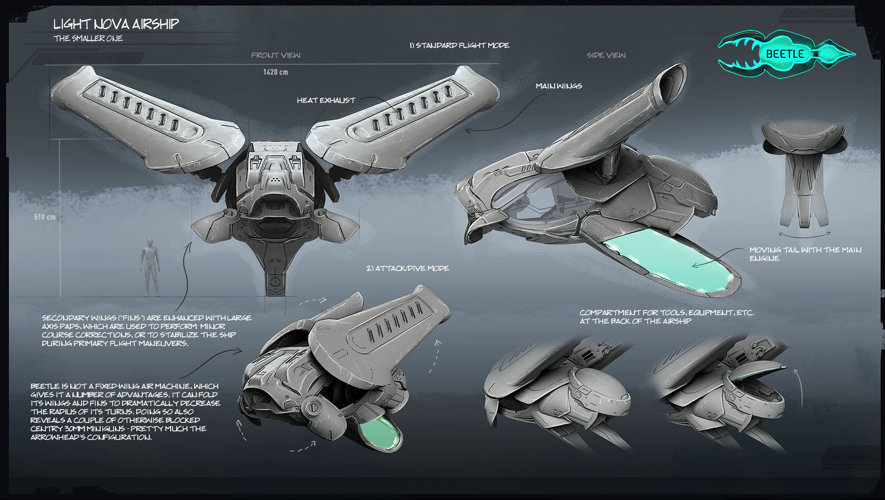 Beetle was obviously intended to be pitted against Hornet, hence the name. It’s hardly an airship, but AmpArms has always had a strong marketing department. The machine handles differently from its counterpart (with the most notable distinction being its “diving mode”, which gives Beetle a slight edge in dogfights by improving its performance in basic flight maneuvers), and its specs vary slightly, but the statistics prove that ultimately, the success in an aerial skirmish still depends on the pilot.
