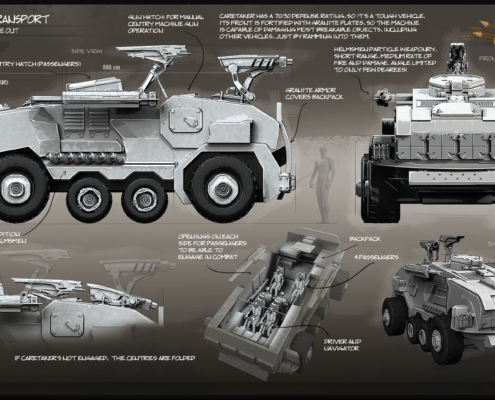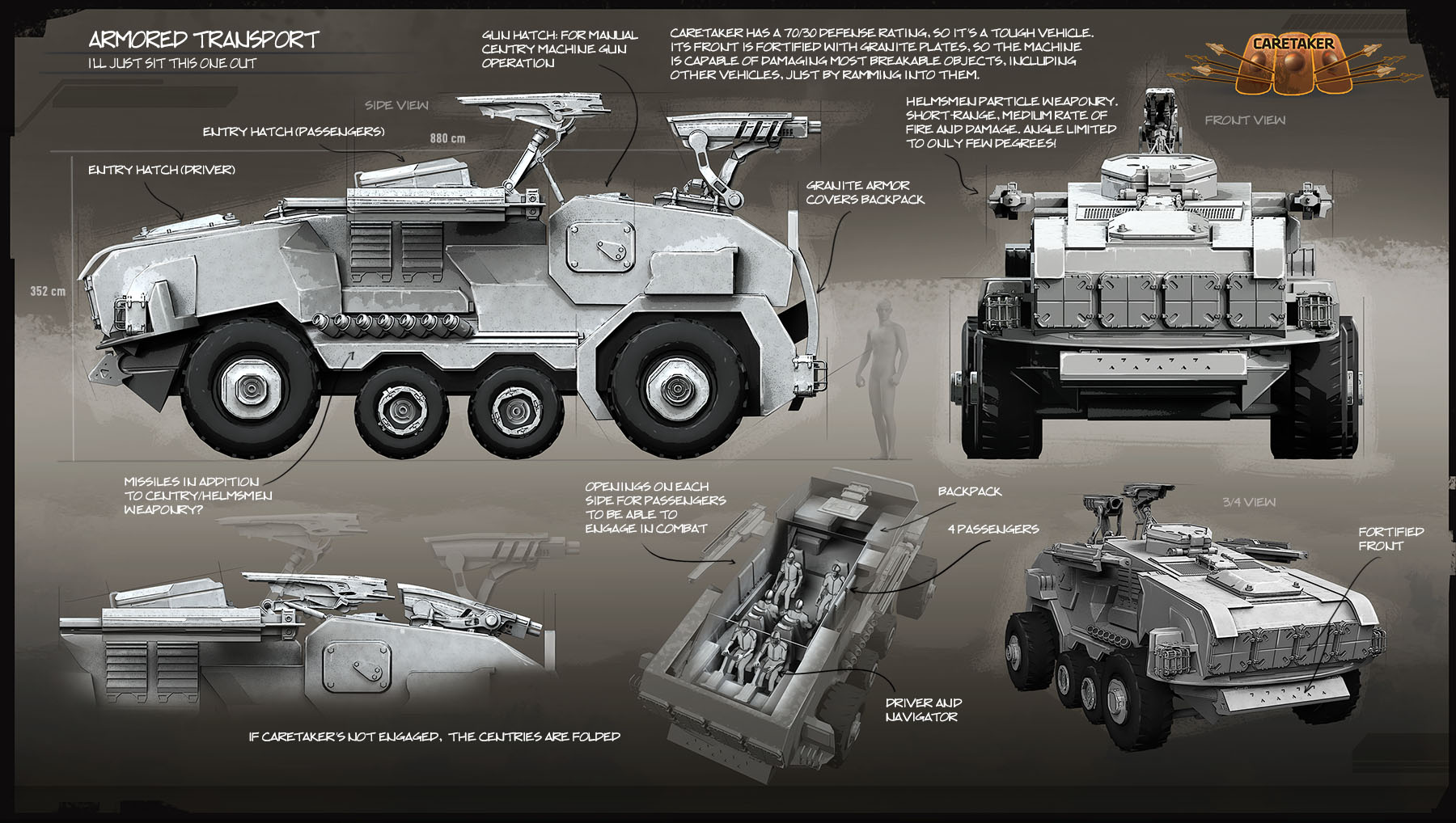 Helmsmen began mass-producing Caretakers after several prototypes successfully returned from one of many suicidal attempts to reclaim Aegis Castle from its Master Demon. The crew was dead, of course, and the machines operated on auto-pilot, but the result was still impressive. Production model offers improved 80/20 protection, provides decent firepower, which can be further improved by its passengers, and can ram almost anything with its heavily fortified front.
