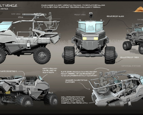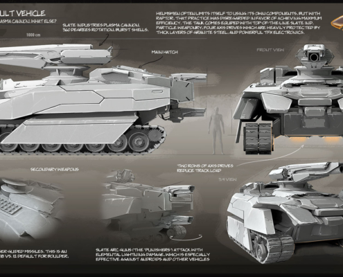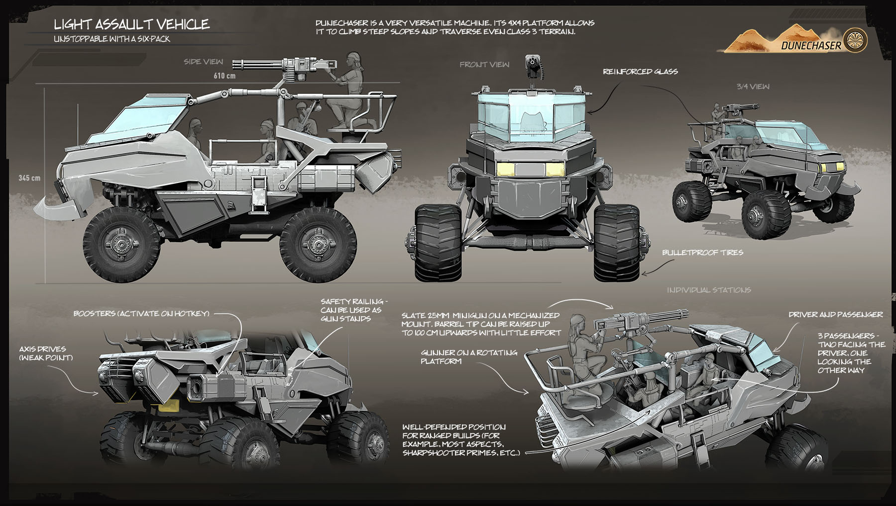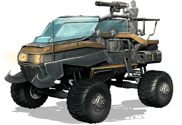 In the early days of its development, this light assault vehicle was known as “Scorpion”, but for some reason the name didn’t stick. Dunechaser is a versatile machine able to conquer almost any terrain, provided no one’s there to guard it. Its attack potential varies greatly depending on the number of armed passengers it carries: when fully packed, it provides a decent firepower on par with that of an Arrowhead, although Dunechaser’s poor defenses still leave its crew vulnerable to almost any retaliation.