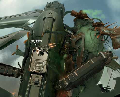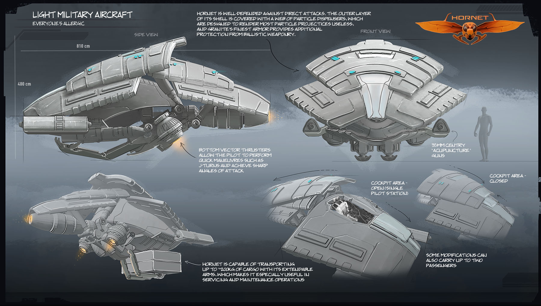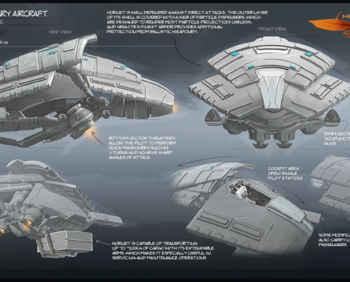 Tough little things, Hornets are a cause of great annoyance for their opponents. They carry decent firepower, and despite lacking the hard coating of Usurpers are notoriously difficult to bring down, especially if the pilot is skilled enough to know the limits of their machine’s maneuverability. Phoenix sacrificed many aircraft to establish dominant patterns of attacks by native threats and fortified Hornet accordingly. The result? Unless a strike is hard enough to bypass strong frontal defenses and deform the machine or kill its pilot, Hornet’s weak points will likely remain intact, allowing the time for an escape or a (suicidal) counter-attack.