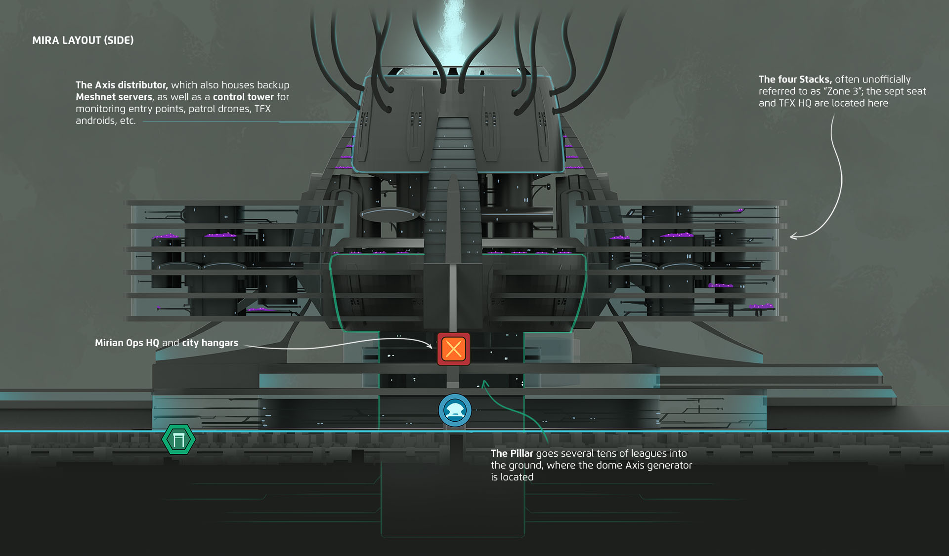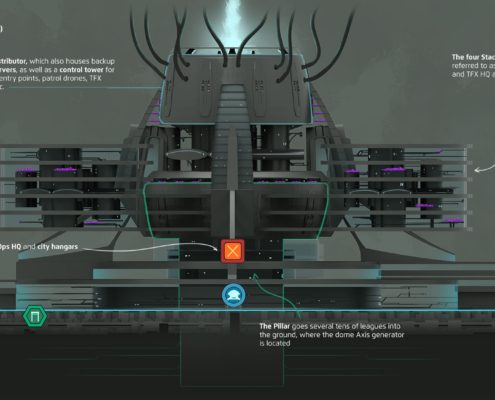 Now it’s bonus time! Since Mira is heavily featured in both Red Crown and Minotaur, we wanted to make sure that the city feels real, so many of its aspects — especially its layout and infrastructure — were designed in detail and visualized.