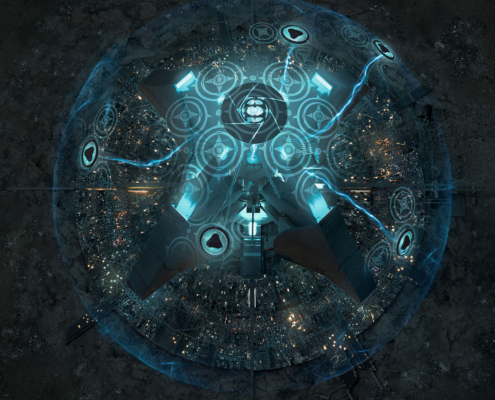 In Troy’s opinion, Mirians bested them all. Unlike other domes which projected their fields from the ground up, Mira was supported by a colossal pillar of streaming energy, which exploded into a beautiful flower high above the city. Vince could see it flickering between buildings; that wasn’t Axis, of course — what he was observing was just light — but someone certainly did a good job with it. The color palette in particular was very impressive: all kinds of blue and purple were giving the central part of the city a very characteristic shade, which the citizens themselves called Mirian blue.