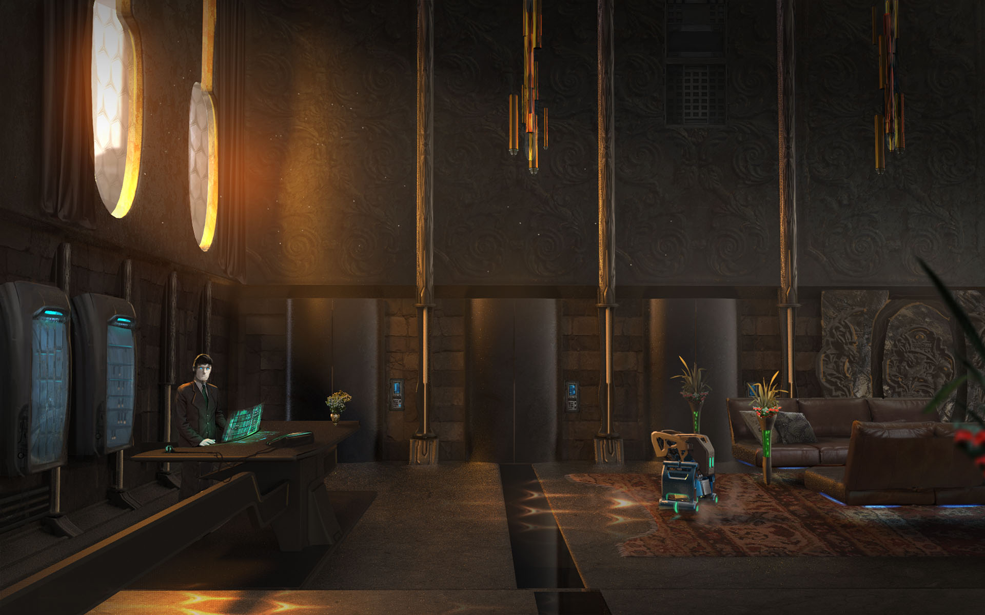 Germa’s complex was almost at the end of the street, near the high wall on which Zone 2 stood. The entrance was open; Vince walked in and found himself in a spacious, well-decorated lobby. An android concierge politely gestured to him.