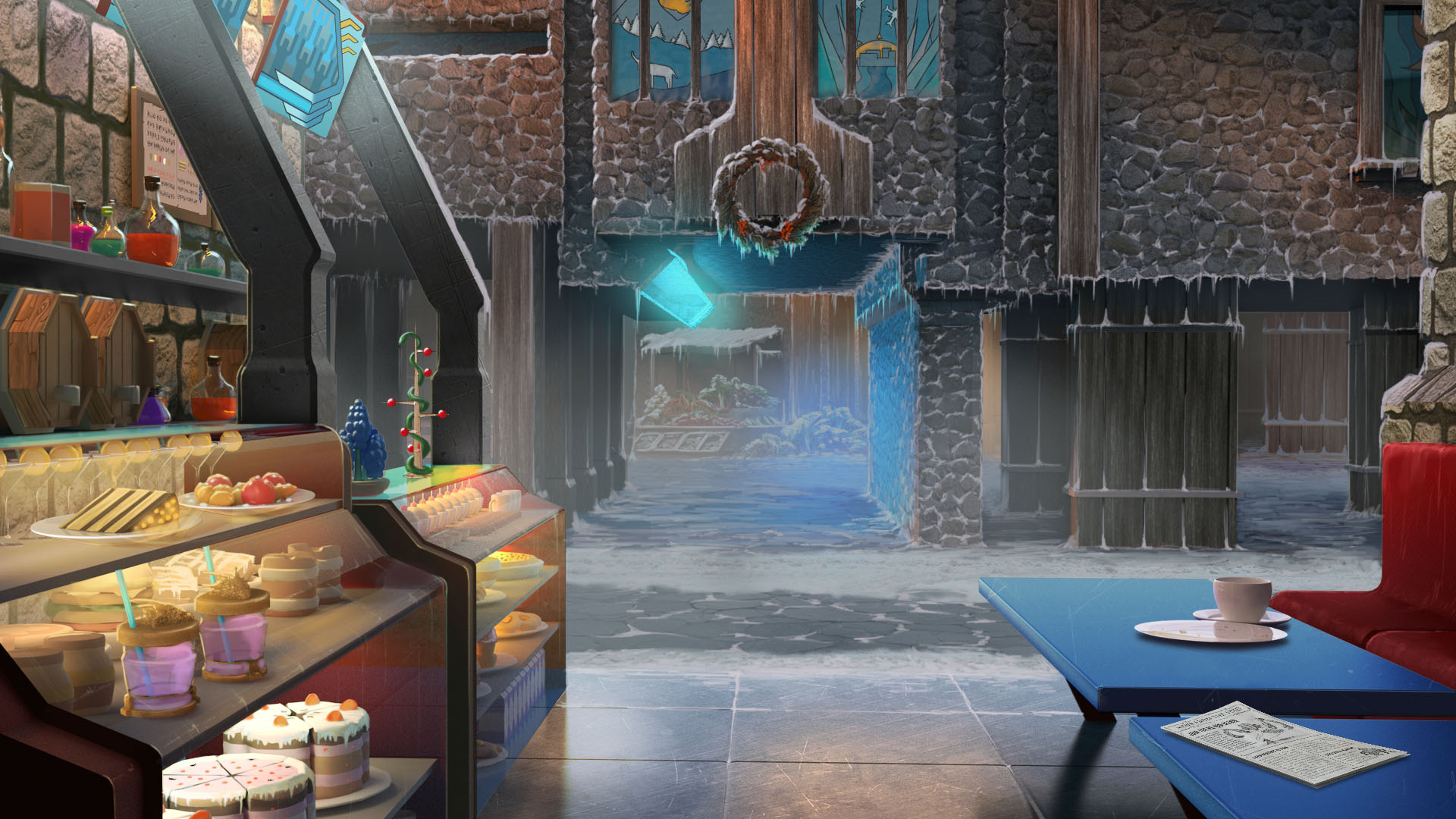 Just above the counter on the left, you can see a menu board with today’s specials. As is almost always the case with Minotaur (and U7 in general), even though it’s quite a small detail, we designed it thoroughly before adding it to the scene. Here it is in all its glory: